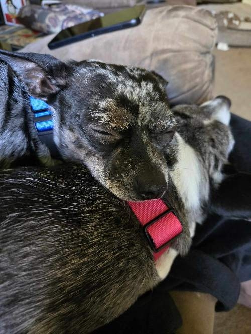 Riot went into the family for a trial adoption and, after 24 hours, had everyone wrapped, including Roxxy. I am sharing a few photos of that love!