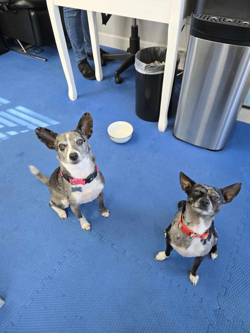 Kathy had adopted Roxxy, a Blue Merle pup with some Aussie shepherd in her @ 3-4 years ago from Rompin Paws Rescue. Kathy felt Roxxy needed a small dog buddy. When Kathy saw Oliver online, she fell in love and wondered if Roxxy would like him.